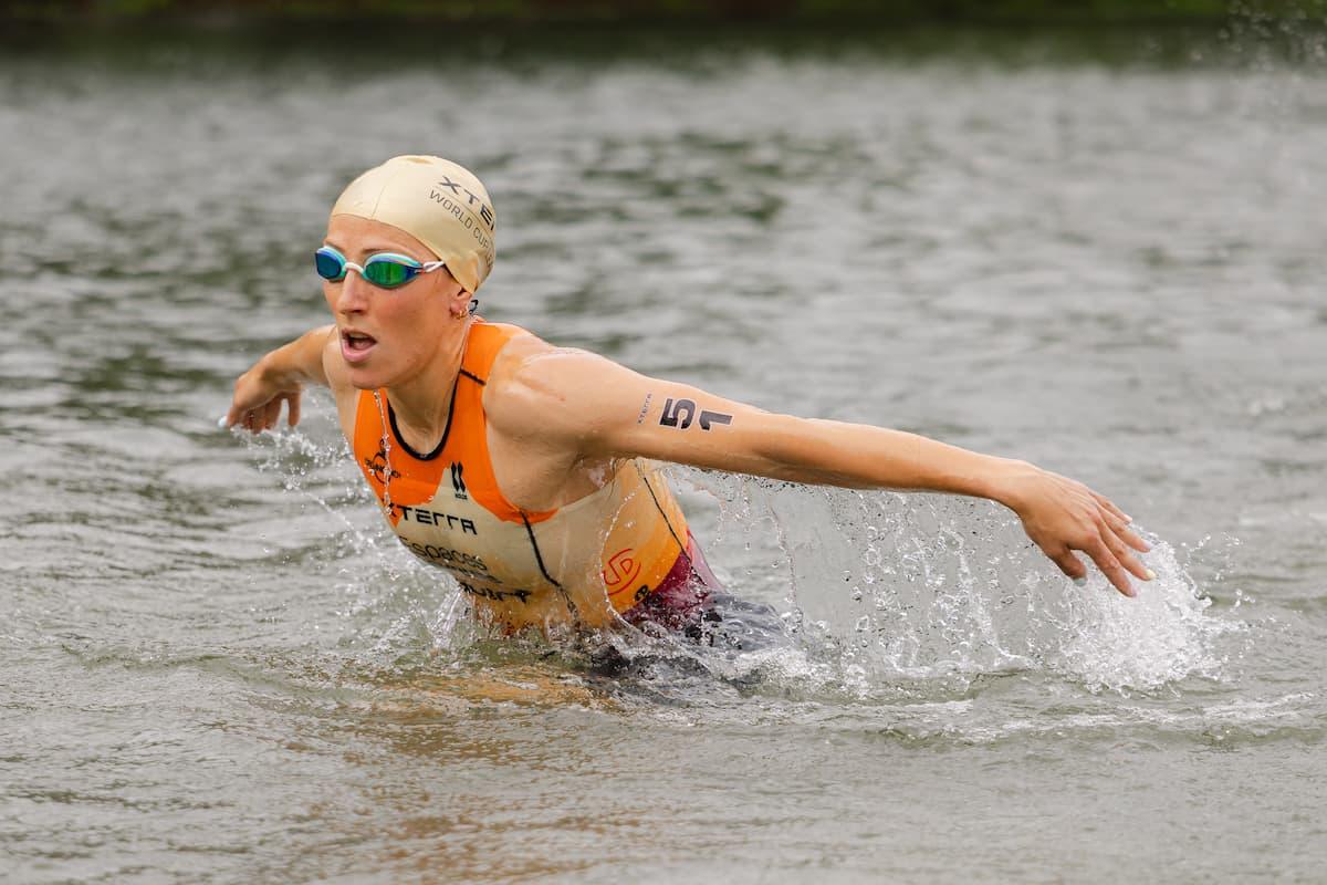 On the women’s side, Paties stayed controlled through the swim, then surged ahead on the bike and never looked back. “It was a bit tricky in the water with the rain, but the bike felt good even though it was slippery, but not too muddy,” she said. “I knew I had a gap off the bike, so I pushed again on the run.” Her 44:54 run split was the fastest of the day. Behind her, Aneta Grabmüller (CZE) stayed steady for second in 2:53:06, and Romy Spoelder (NLD) followed close behind in third at 2:53:24.