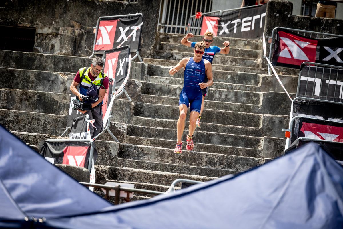 Arthur Forissier (FRA) was 34 seconds back out of the water but made his way to the front of the bike with Pujades, Bonacina, and Kočař by the top of the climb to the fortress. By the end of the first lap, Kočař and Forissier had pulled away a bit as Maxim Chane (FRA) and XTERRA World Cup leader Jens Emil Sloth Nielsen (DEN) moved into third and fourth.