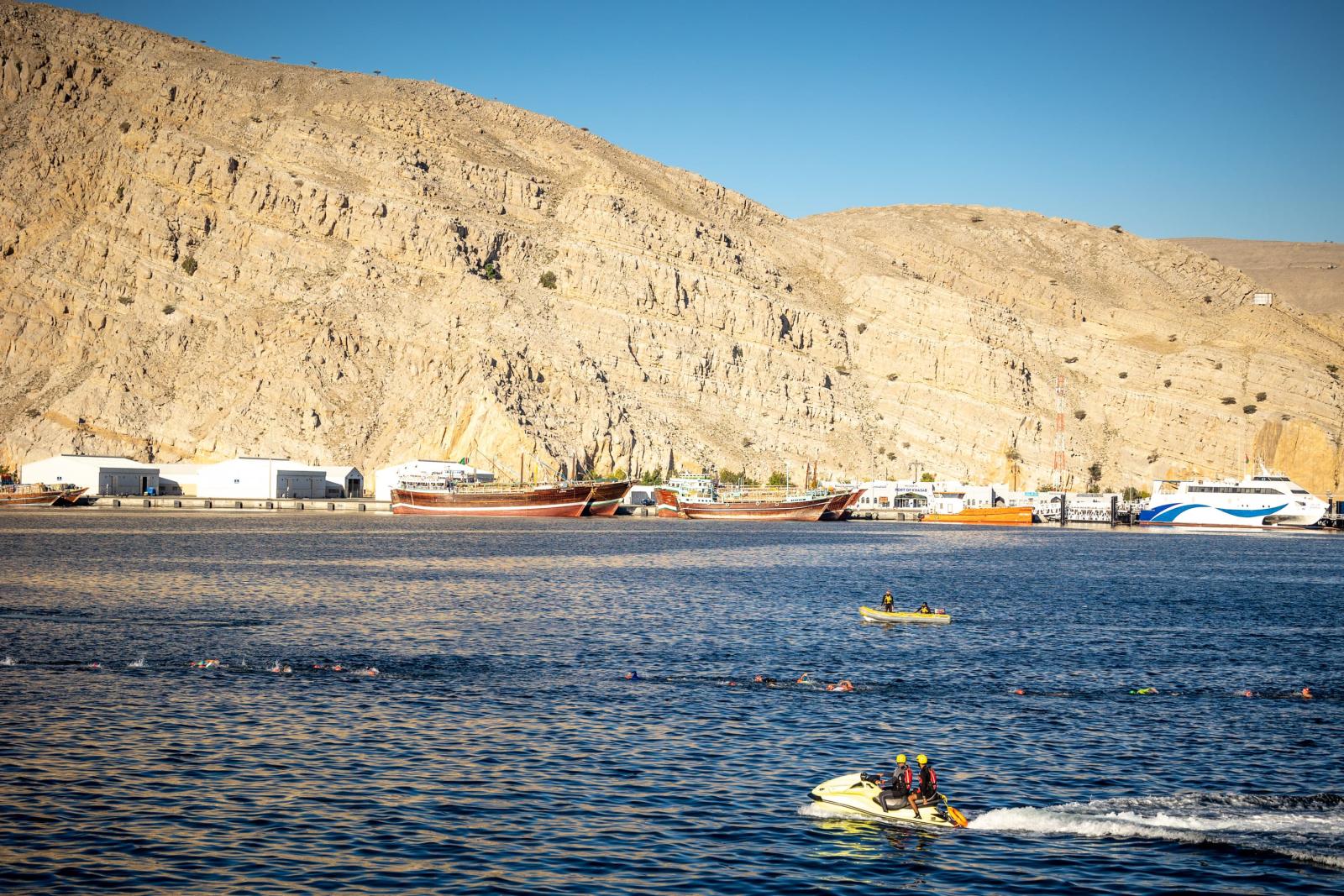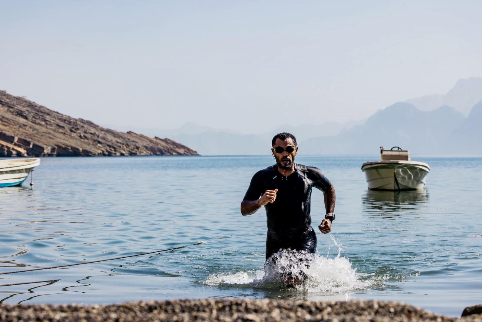 The Full Distance Race is known for its demanding terrain amidst the scenic charm of Musandam’s unique geographical and historical significance. It starts off with a 1.5K swim, where athletes dive from a ferry with varying conditions, from calm to potentially rough waters.