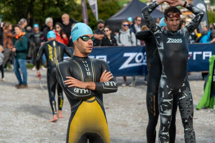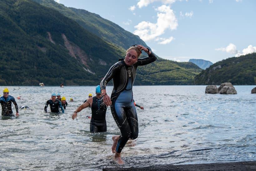 At 11:15 the first wave of age division athletes took to the water in a flurry of splashes and elbows, followed closely by the rest of the pack as the race began to take shape in the 18°C waters of Lake Molveno.