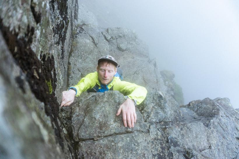 We stumble onto the summits, eyes glued to the navigation on our watches, tumbling almost into Scafell's rock turret on England's highest mountain. Time is gushing away from us. But after twenty hours of movement and just two hours of sleep, concentration must be sharp. The Broad Stand rock climb separates us from today's final 964m peak, Scafell.