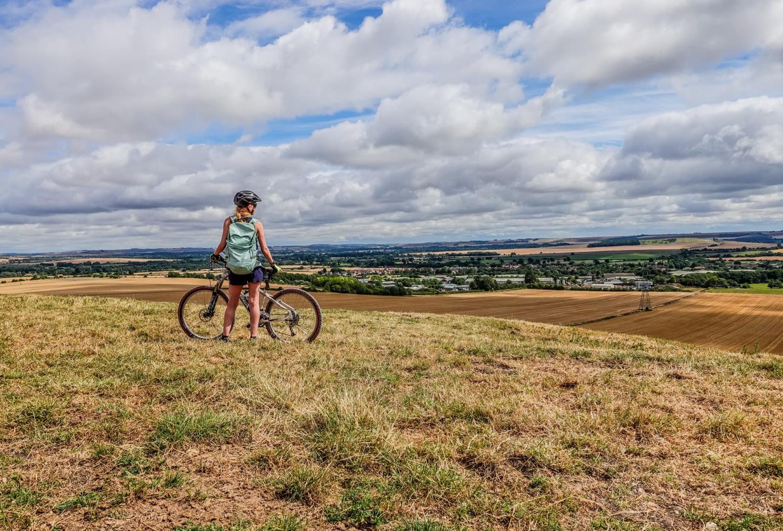 Westbury is a small town at the foot of Salisbury Plain’s westernmost ridge and we’re immediately faced with a steep climb up a rocky, crumbly chalk trail. We push our bikes up, gaining height quickly and eventually reach the Imber Range Perimeter Path, a byway that encircles one of the military firing ranges. It’s not long before we find ourselves at the top of the Westbury (or Bratton) horse. Having captured the first chalk equine, I feel like the adventure has truly started.