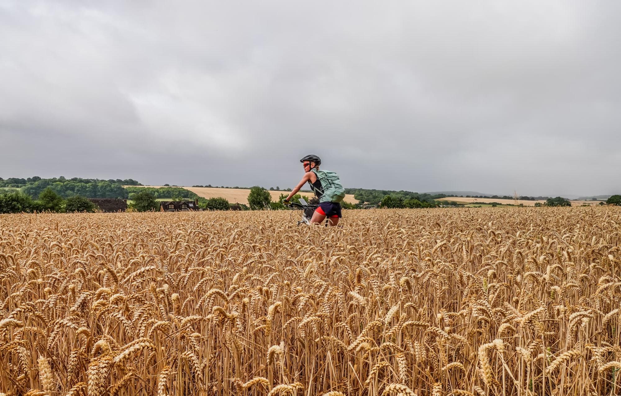 Britain is in the grip of a long, hot dry spell and the terrain shows it. The trails are rock-solid and rough. We clatter along, soaking up the ridgeline views, until we reach the Salisbury Plain Training Area range and find a red flag. Literally. While you can ride around the Imber Range during live firing, the same does not go for this one. Sabotaged, we pedal along the wheat field bridleway to the dulcet tones of a combine harvester in the next field. We whizz downhill to the edge of a village to find a string of wicked bridleways and byways running behind the houses.