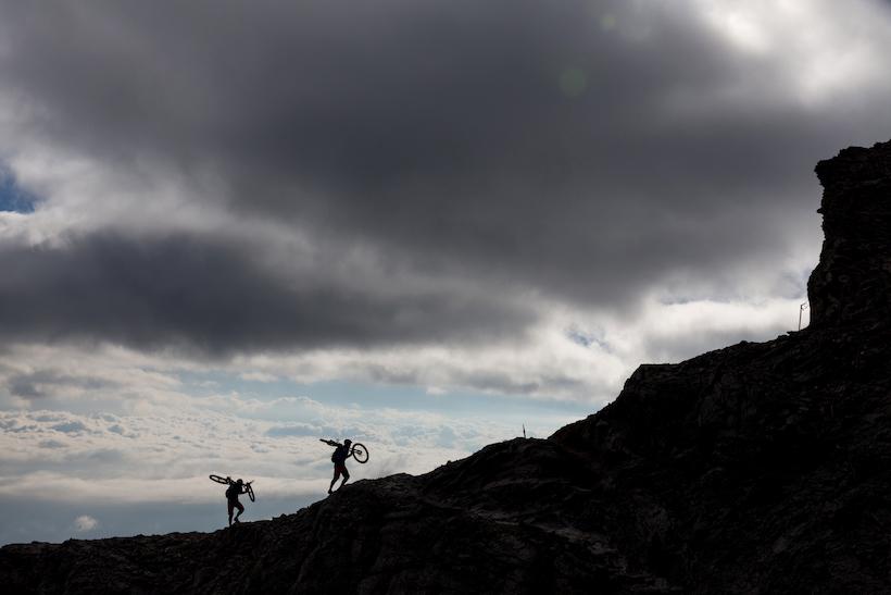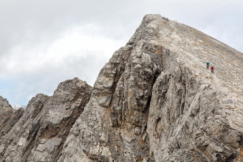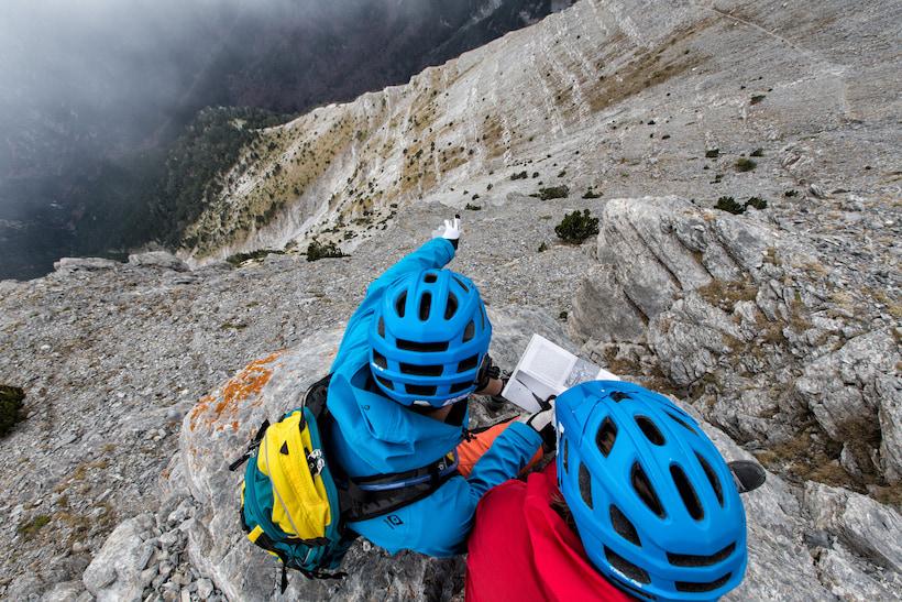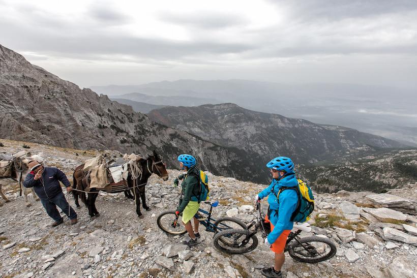 The wind intensified overnight rather than subsiding. It took considerable effort to pack up our windswept tent and gear. With numb fingers, we resumed our climb towards Skolio peak. Although it stands seven meters shorter than the main peak of Mytikas, Skolio is deemed navigable by bike. Traversing the near-horizontal face of Mytikas on a path barely as wide as a handlebar, one false move could send a rider plummeting into mythological doom. The steep ascent required us to dismount and carry our bikes, reinforcing our respect for the pioneers who dared these paths without the aid of modern bikes.