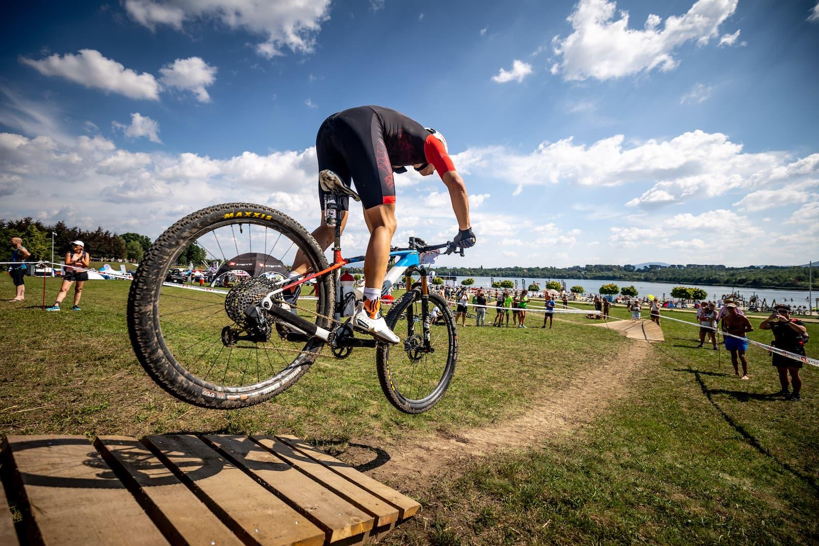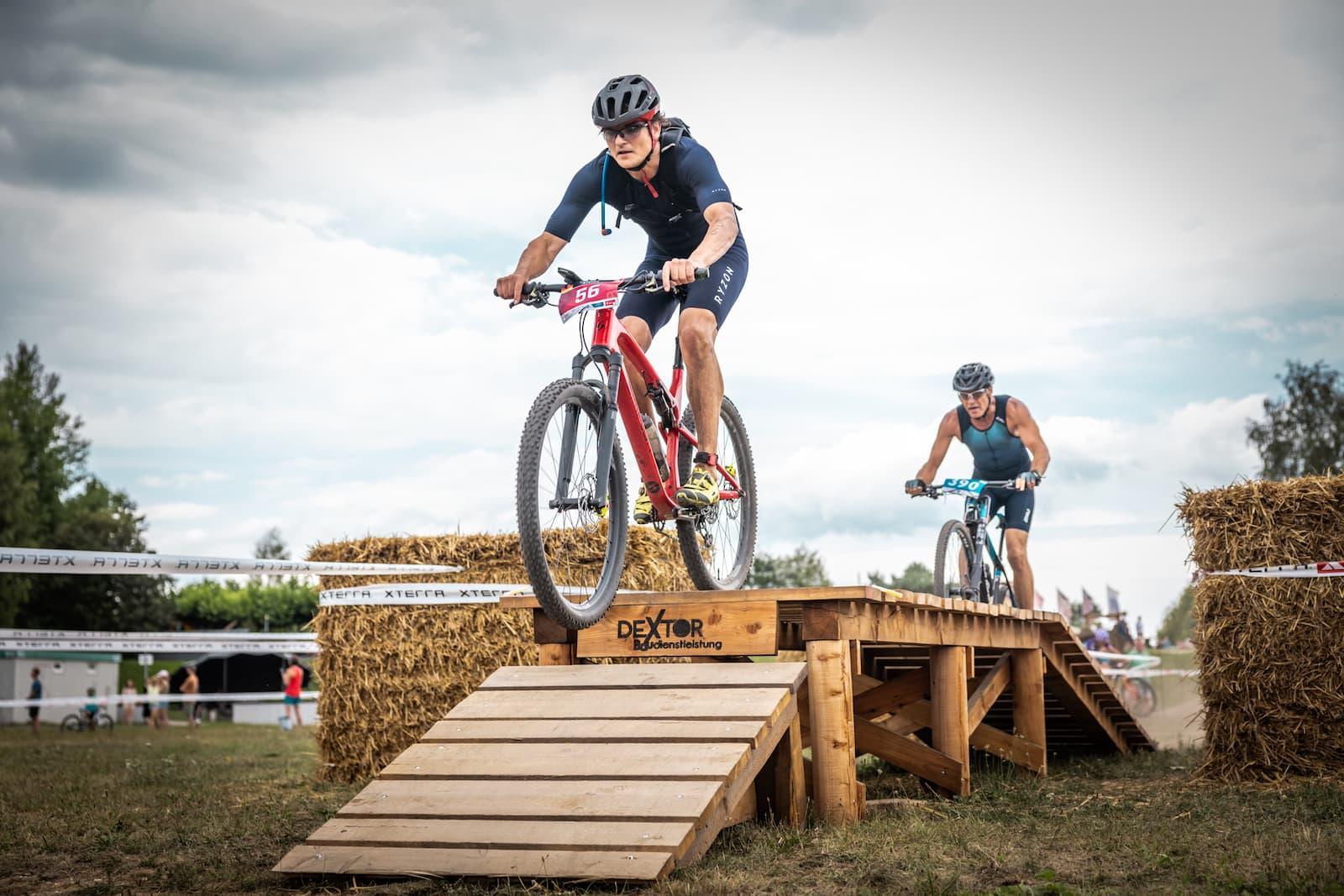Bike (37K): The single-lap, 37K mountain bike course through the Zittau Mountains Nature Park is a true test of fitness and technique. With over 1,000 meters of elevation gain, riders face fast gravel roads, technical climbs, and rocky descents. The course's highlight is the final wooden 180° bend directly in Lake Olbersdorf, a legendary feature that challenges even the best.