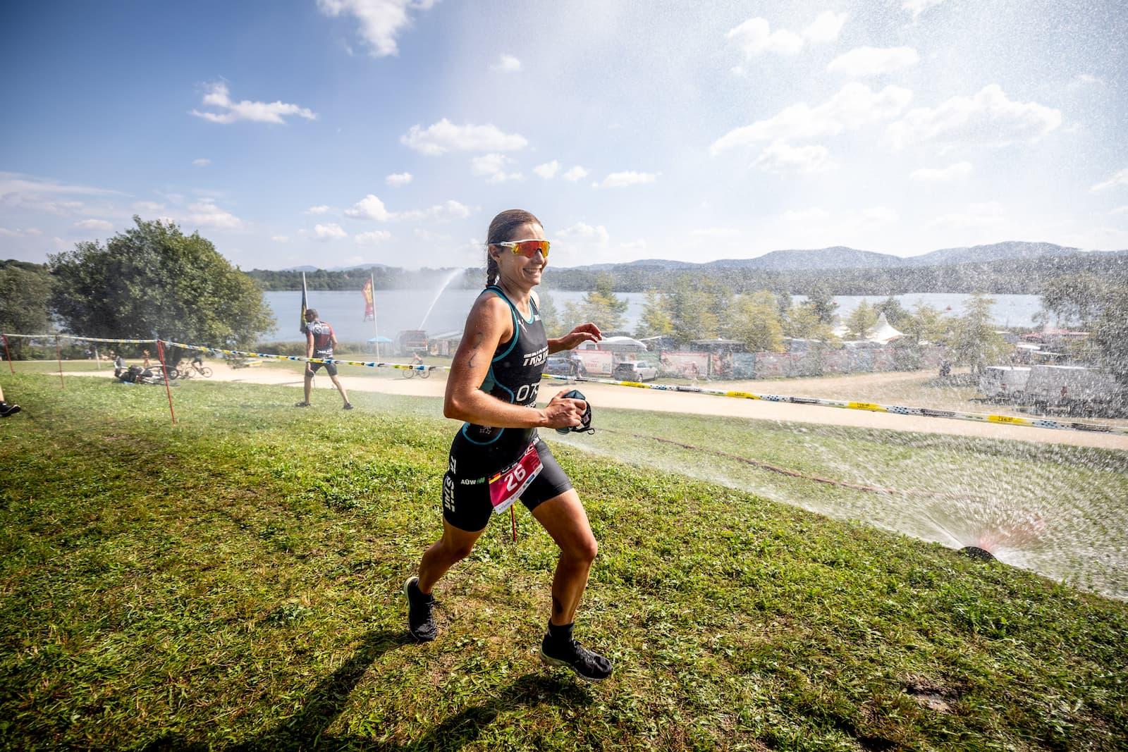 Swim (1.5K): Athletes begin with a 1.5K swim in the warm, clear waters of Lake Olbersdorf. The two-lap triangular course, featuring an Australian exit, offers a fast, spectator-friendly start to the race. Wetsuits are typically unnecessary as water temperatures hover around 25°C-26°C.