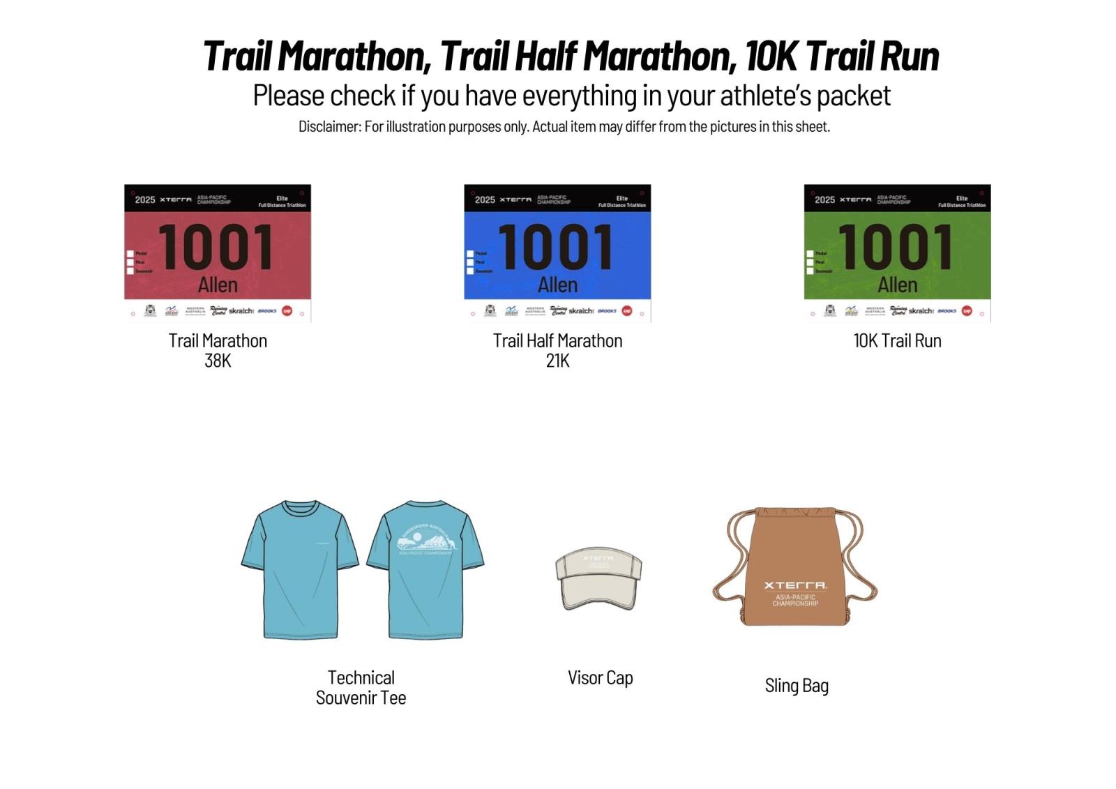 The race packs for Trail Marathon, Trail Half Marathon, and 10K Trail Runs will include: