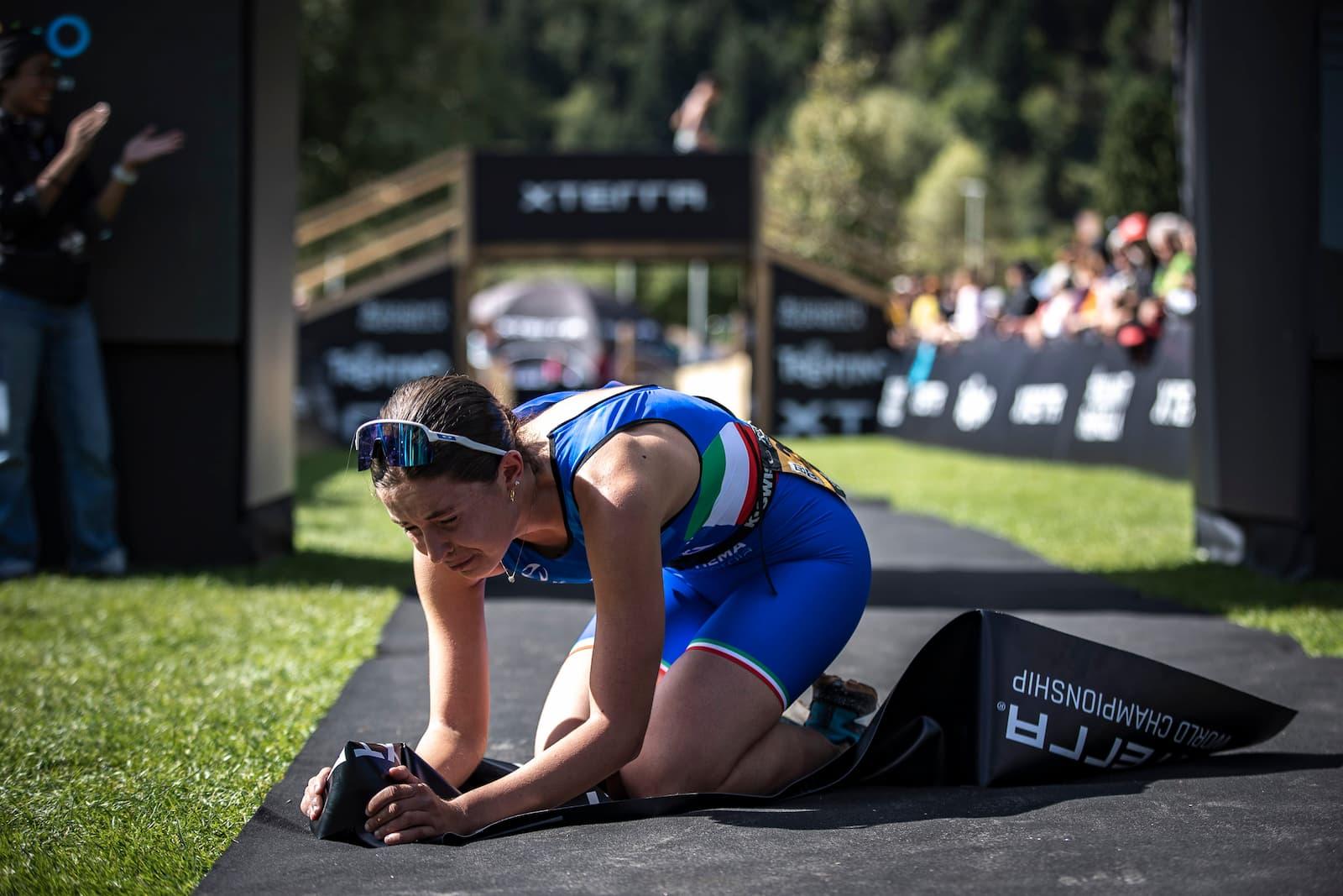 Anna Gazzari (ITA) won the Junior female category on home soil with a total time of 1:48:55. She led the swim with a time of 10:15, 41 seconds ahead of Theresa Beraus (DEU). Gazzari maintained her lead during the bike segment, finishing at 1:18:16, over two minutes ahead of Agathe Claude (FRA). "I really enjoyed the bike; I’m a strong biker, and I’m feeling great," Gazzari said. She continued to explain, "For me, the run in the forest was the hardest part of the race. The swim was good; the water wasn’t too cold for me.” Claude finished second at 1:51:22, 2 minutes and 26 seconds behind, while Marie Martinez (FRA) took third place with a time of 1:52:00.