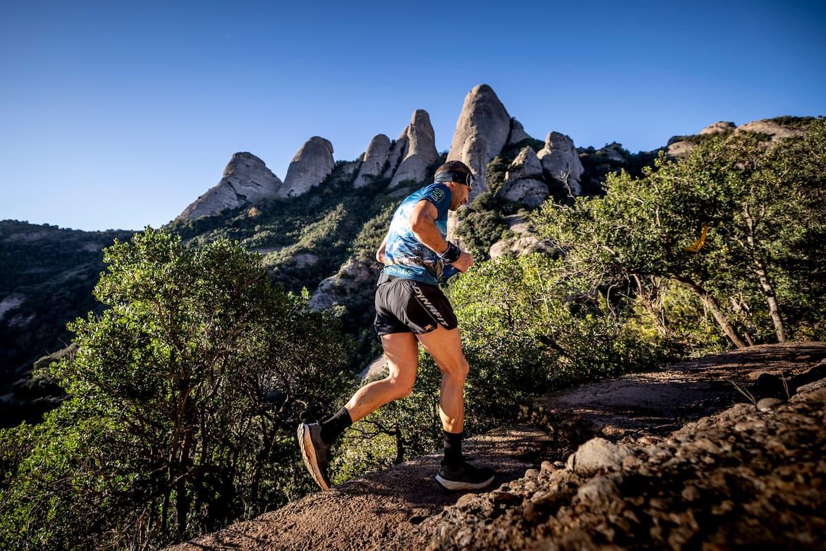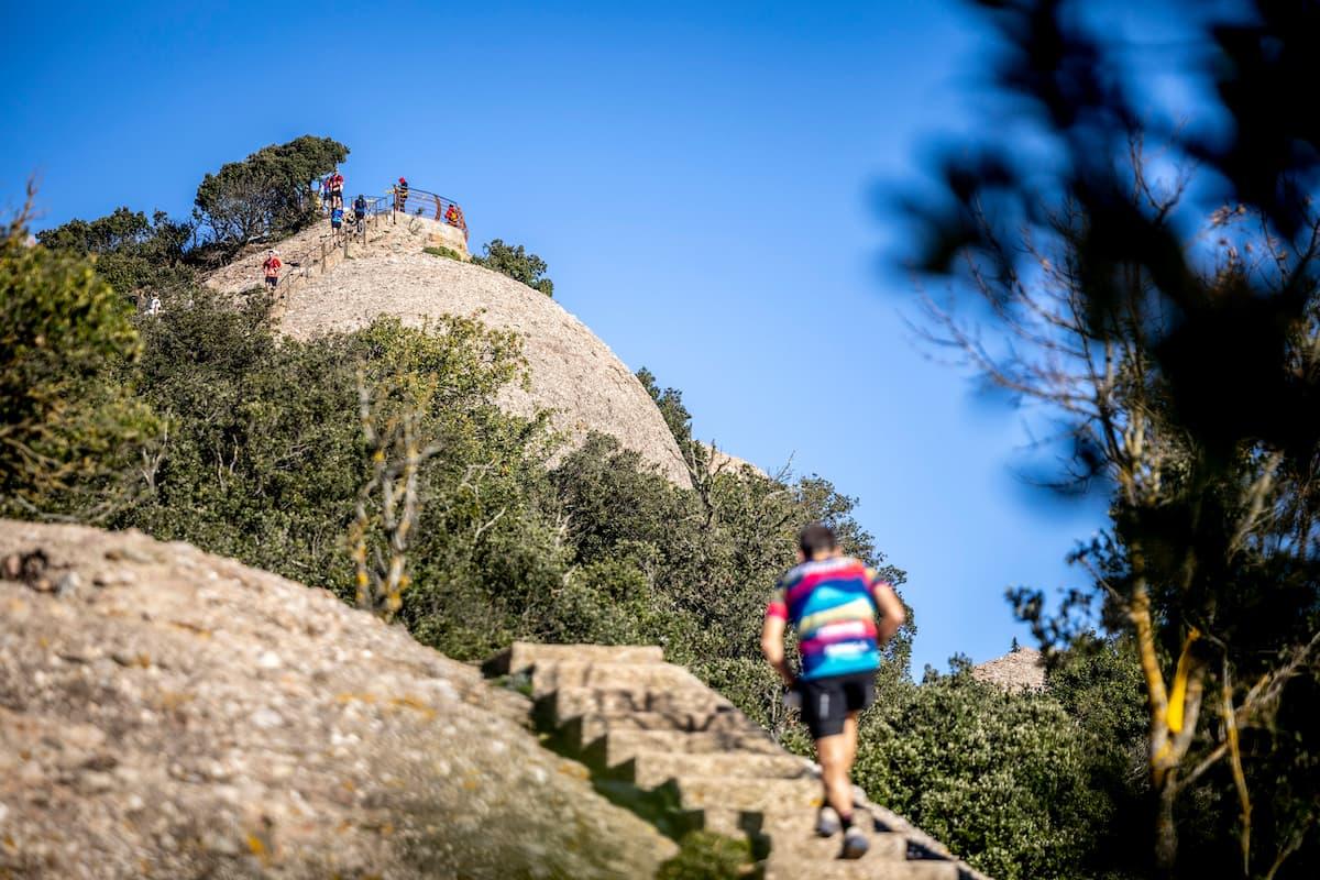 The Cursa de l’Alba, now in its 37th edition, covers about 22K with 1,200M+ (3,900 ft+) of elevation gain. Beginning in Collbató at the base of Montserrat, the route climbs through ancient stone steps and forest trails toward the Pla de Sant Miquel, then continues past the monastery before ascending more than 1,200 steps to Sant Jeroni. The descent follows technical mountain paths back toward Collbató, completing one of the most respected courses in Catalan trail running.