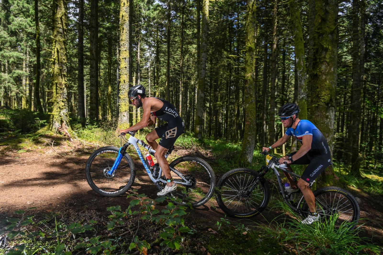 Bike (40K): The mountain bike leg covers 40 kilometers over two laps, climbing roughly 600 meters each time. It starts on flat ground before a sharp left turn takes riders into the first major ascent. The trail cuts through dense pine forest, with stretches of mossy singletrack and technical sections that demand attention. Descents are fast and flowing, and the second lap can punish anyone who overextends early.