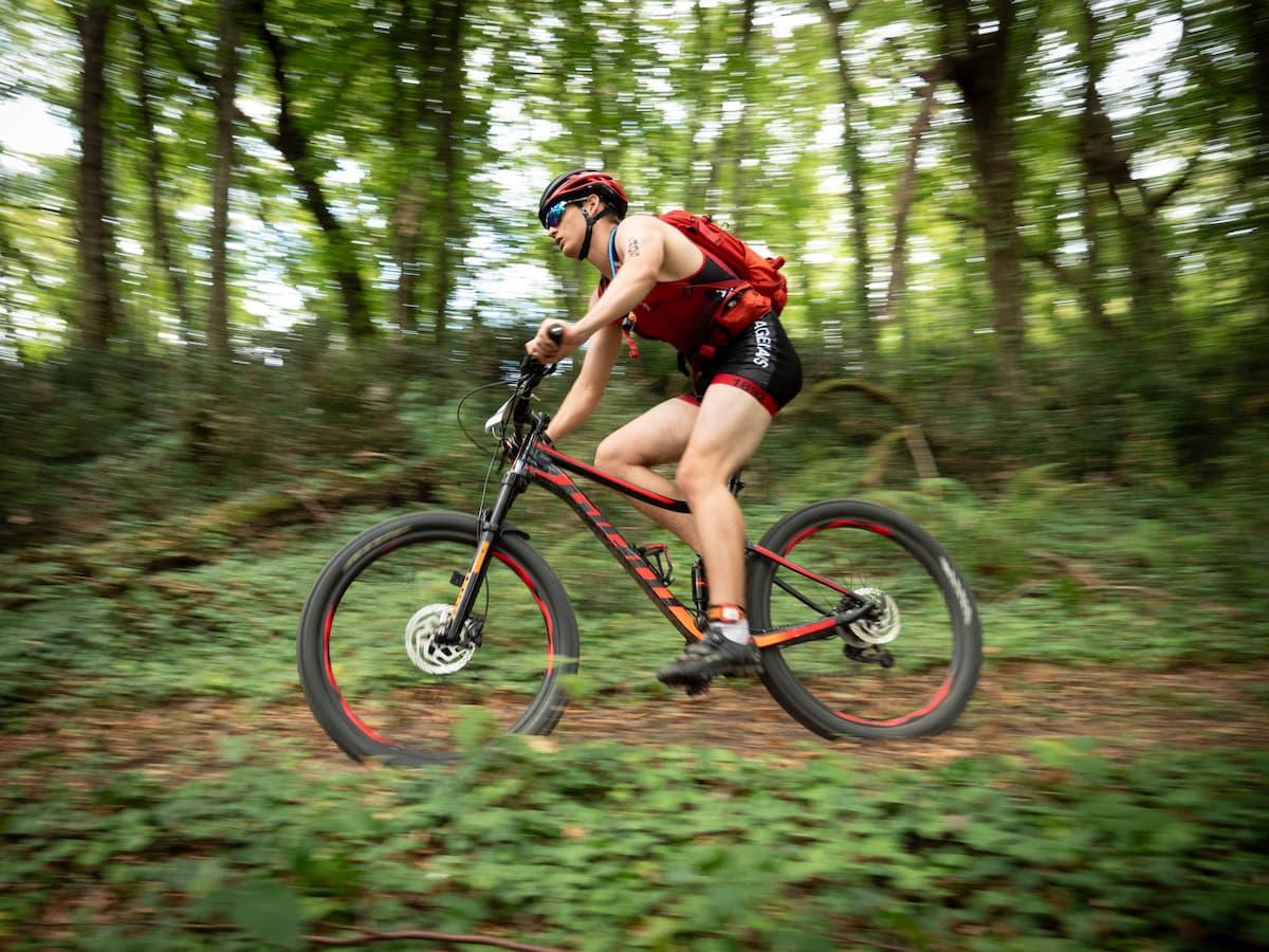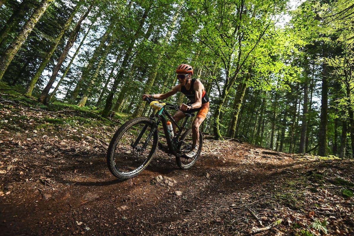 After the swim, competitors head into the 33K mountain bike course, with roughly 85 percent of the ride on forest trails. This segment includes fast descents, rocky climbs, and singletrack weaving through pine woods and across granite ridges. Riders face a total elevation gain of about 912 meters as the course loops around the upper slopes of Vassivière’s basin. Described by local tourism as “a paradise for mountain biking,” the terrain rewards those who can handle both the technical sections and the physical effort required on longer forest climbs.