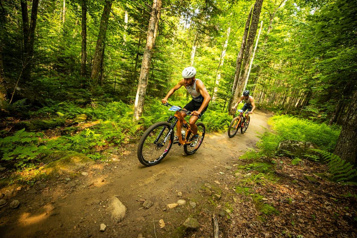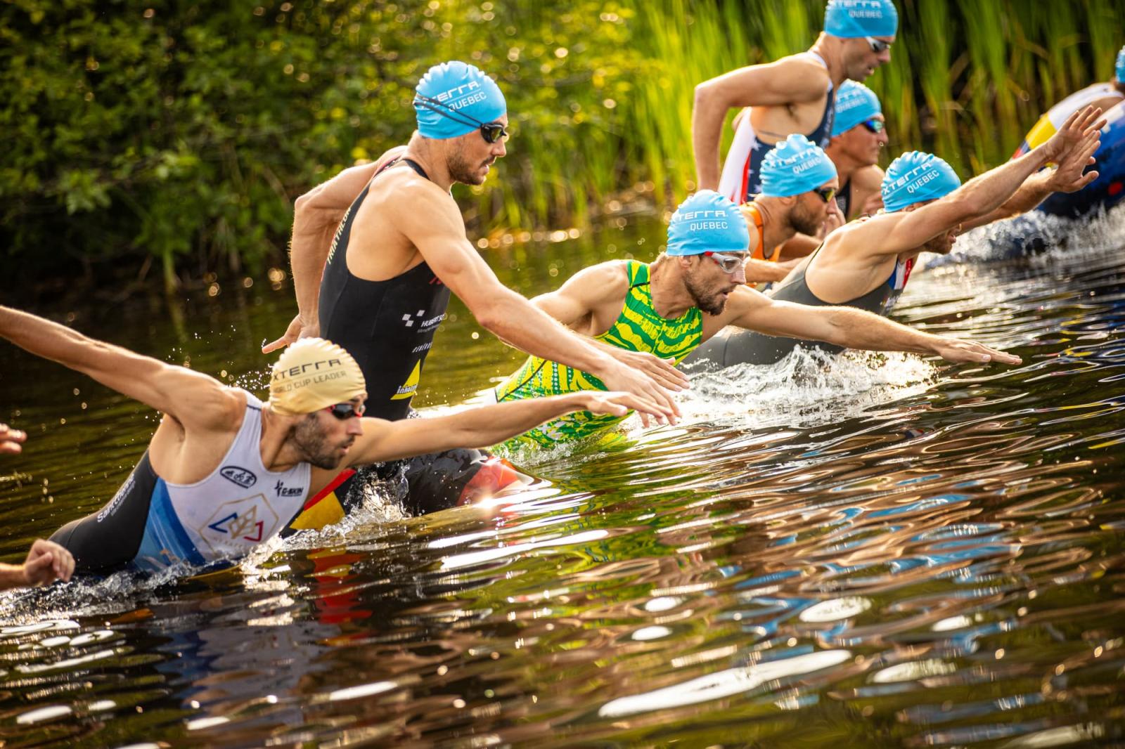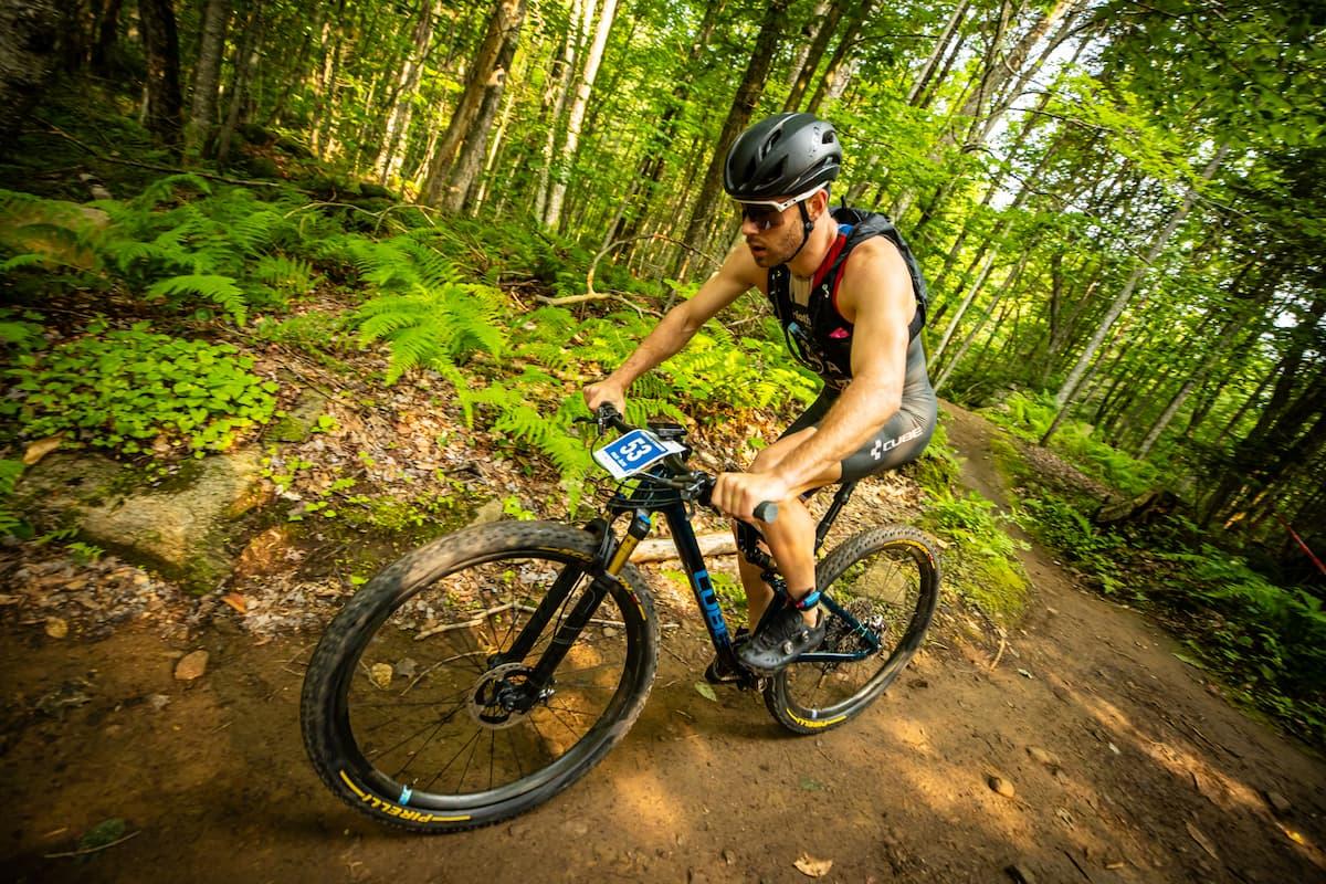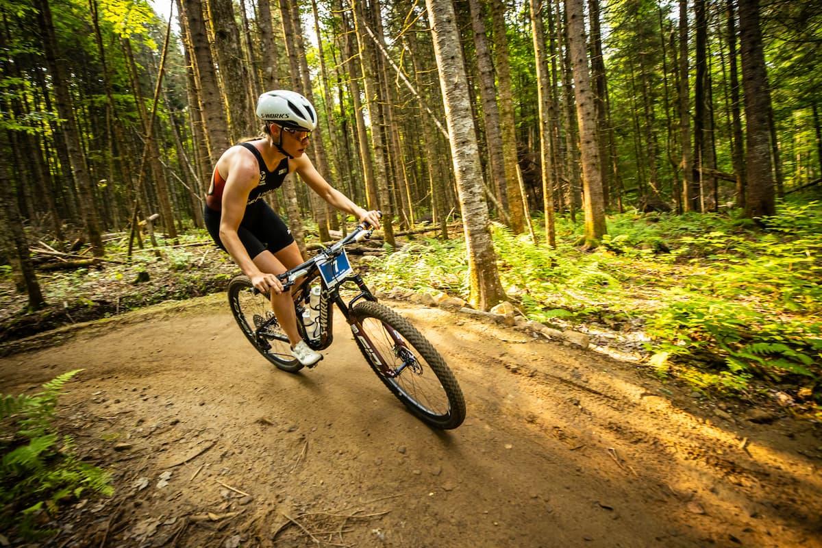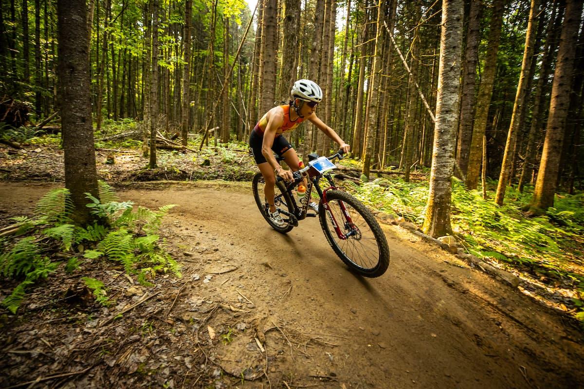 The trails of Empire 47 began in 2013 when the race organizers, led by Alain Déraspe and Christian Déry, cut six kilometers of singletrack by hand. Over the years, their work grew into a world-class network of more than 75 kilometers. With the air temperature at 29°C (84°F) and Lac Delage at 23°C (73°F), athletes started with a two-loop swim in the clear lake before heading into a 31K MTB course full of punchy climbs, fast descents, and winding singletrack that rewarded flow and control. The final 11K trail run began on flatter paths before climbing steadily to 190 meters and finishing back at the heart of the festival.
