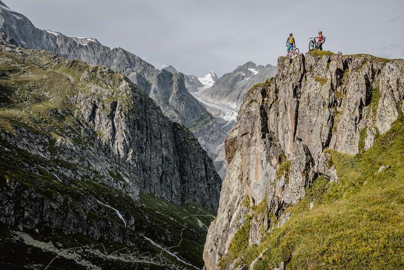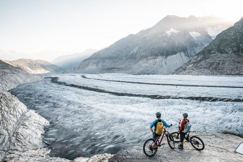 Sweat trickles down my forehead and into my ear as I try to keep my pedaling rhythm steady. The bumpy logging road to reach Fiescheralp has steepened noticeably. I glance at my cogs, relieved to find one gear still in reserve. Breathing hard, I'm unable to speak. My focus narrows to the essentials: gear down, breathe quickly, pedal slowly, and keep moving toward the next hairpin. Sneaking a glance over my shoulder, I see the valley stretched out far below, with Caroline right behind me. It's our first time in Valais, and though we've never been here before, enthusiastic stories and thorough research have painted a vivid picture of the magnificent view from the top of the gigantic Aletsch Glacier. Since breakfast, we've been repeatedly pondering: will it look as impressive in real life? Filled with anticipation, we keep pedaling.