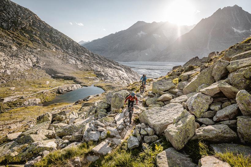 "It's even more impressive than in photos," I comment enthusiastically. Back on our bikes, we relish the trail, adorned with granite slabs that soon weave among massive boulders—a pure joy! The landscape reveals a deeply cut valley, sculpted over millennia by the Fiescher Glacier, making it a perfect spot for another photo break.