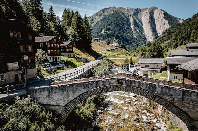 Once past Ausserbinn, the gentle trail continues to Ernen. In the village center, the wooden houses typical of the region stand closely together. The village square is one of Switzerland's most beautiful historical sites, and we're thrilled that the historic buildings are so well-preserved. The trail then meanders upstream to Reckingen, the region’s oldest mountain village. A sign indicates the path to the other side of the valley, where the Stoneman Glaciara leads us through centuries-old mountain villages, seemingly frozen in time.