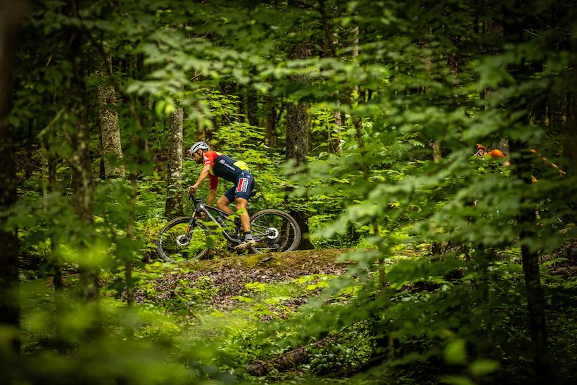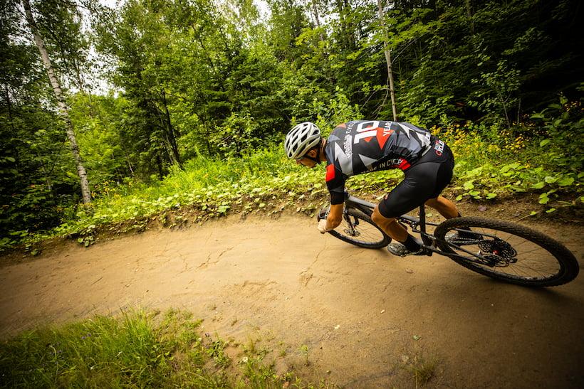 The XTERRA Québec course now threads through the evolving trail system while still tracing the bones of the original, hand-built six-kilometre loop from 2014. The route unfolds like a story across the land. It starts with a gravel-lined straightaway before a safe street crossing leads into the network proper. From there, a warm-up climb winds through the Évolution zone and into La Grimace's undulating terrain. Then comes Kerozen—the trail that started it all—still rough, still rowdy, and still earning riders' respect. The course then opens into scenic sections like Family and Huron before picking up speed through Pètepisrépète's fast rollers. The longest climb, Apex, leads to one of E47's best-loved descents: Shaman, with smooth berms and fast, flowing lines that urge riders to let loose. The course finishes with a mix of forest singletrack, river-crossing boardwalks, and the jump-filled Pada-One line that funnels into E47's paved pump track.