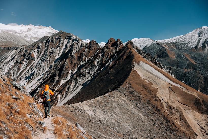 We set out pre-dawn once again, the quiet settlement of Kyanjin Gompa disappearing below us as we climbed to our high point of the valley at 4800m above sea level. It was at this point that I turned a corner and a long flowy trail revealed itself in front of me, running all the way back from the summit of the mountain back down to the town I’d started from that morning before dawn. The sun had not long shown itself behind the towering 7000m+ peaks that make up the head of the U shaped Langtang Valley on the border of Nepal and Tibet.