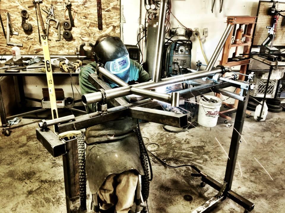 Of course, to build these bikes, Jake also had to design and build different machines and adaptations to them. “Jake has the ingenuity and skillset to make those things possible for someone in a chair,” Kirk marvels. “Stuff” is Jake’s technical term for some of the mods, “fixtures that hold onto other fixtures,” he explains. “I also made a gigantic rotisserie-like bike holder; it spins the bike in the air, allowing me to move the frame around so I can get to all the welds.”