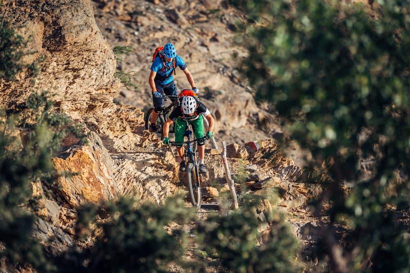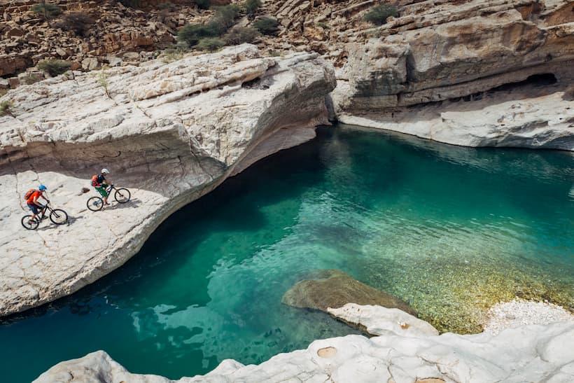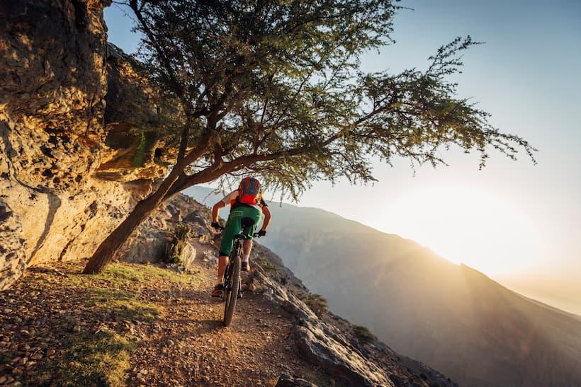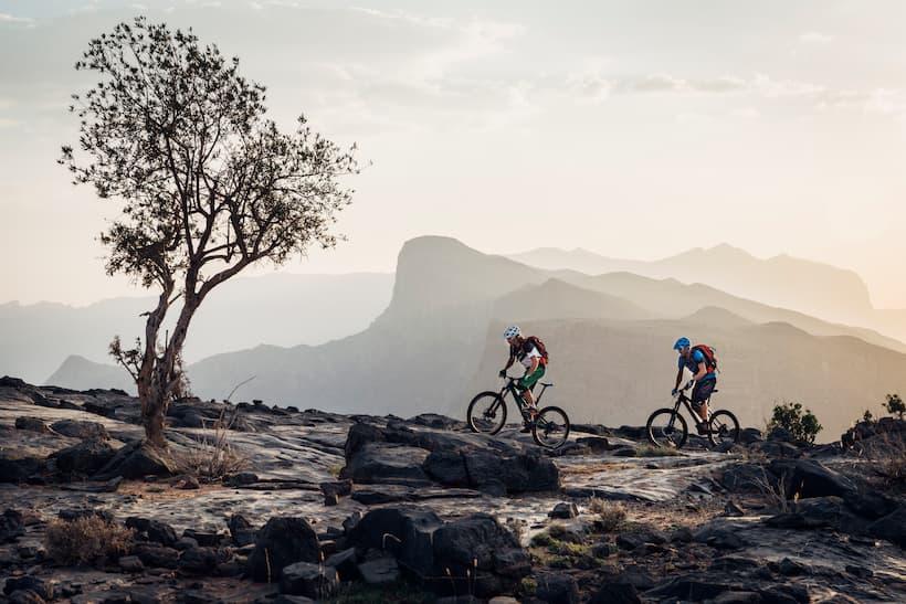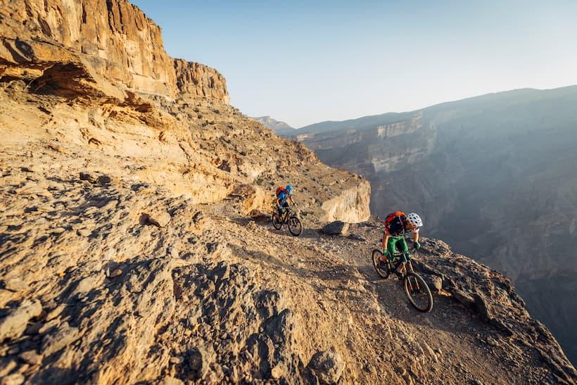It’s so incredibly hot our breath stalls as we exit the airport building to pick up our used SUV. Who said anything about bearable temperatures? The display in the car says 42 degrees. We break a sweat just loading the bikes. We’re so glad our first stop is about 2000 meters above sea level. We hope it’s cooler there. We start our trip well air-conditioned and stocked up on supplies and lots of water. The perfectly built highway leads us to a yellow and red hilly landscape. Doesn’t it have to go uphill anytime soon? We’ve been driving on a plain for hours. Finally the mountains begin to look higher and the road changes. The asphalt soon turns into a bumpy gravel road that leads up the mountain. The table mountains surrounding us are cast in a fascinating light as the sun sets. We reach the bungalow complex in the dark of the night, check in and are happy about the cool evening air. After assembling our bikes we set off to explore some paths on the Djebel Shams plateau. The mountain range is named after the highest mountain in Arabia which rises 3005 meters into the sky right across from our accommodation. In between lies a nature spectacle that couldn’t be more impressive: the “Wadi an Nakhur,” the Grand Canyon of Oman, cuts off the direct path to the peak of the highest mountain with its 1100 meters of vertically dropping walls. Only about 400 meters separate our accommodation from the edge of the canyon. The depth almost sucks us in. We can see a small path from where we stand about 150 meters below us. It follows along the edge of the canyon like a balcony. This must be it. The so-called “Balcony Walk” - the most famous trekking route in Oman.