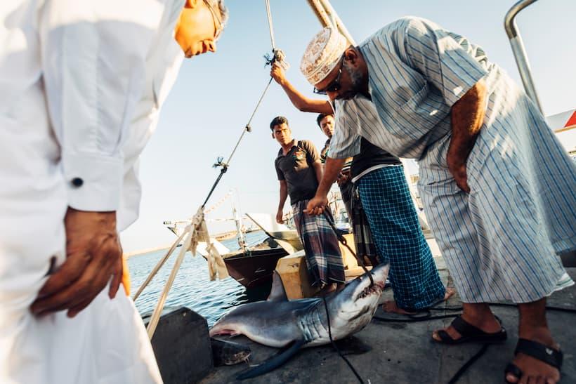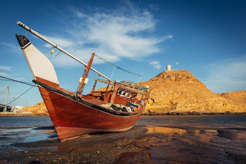 Our trip continues towards the coast the next day. The harbor city Sur is close to the eastern extension of the Arabian peninsula and is said to be the city in which the legendary Sinbad was possibly born along with the city of Sohar. That’s not the only reason we want to visit the city by the lagoon built of completely white houses. We want to see the Dhaus, the traditional wooden boats, that you can only find here. The boats used for fishing are made without any drawn plans, simply by visual judgement and oral transmission. Even though the main work done today in the dockyard is repairing the boats and not manufacturing them anymore, they are everywhere in the harbor. The fishermen return to the harbor early in the morning and offer their catch for sale. You can buy everything fresh here from tuna to rays to sharks. We ride to a small hill above the city. A tower made from clay waits for us. We enjoy the view over the entire lagoon from here and the cityscape dominated by minarets and mosques. The white houses put on an artistic display in contrast to the blue ocean.