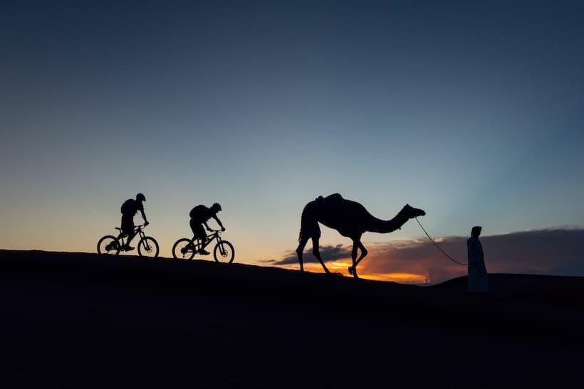Two bedouins with a camel stop by the next day. They own a desert camp not far from ours. They were worried if we were ok and if we’d made it through the sandstorm fine. Not many people camp in the desert in tents without being escorted by a local guide. They invite us to their camp for some coffee. We gladly accept and follow them to their housing since our efforts in riding our bikes in the morning didn’t exactly go as planned. Coffee, which is called Qahwa here, has a long tradition and is almost something like an Arabian magic potion. It’s the prime example for Arabian hospitality. It brings together people from different cultures in a wonderful way. Everybody has their own special secret on how to prepare it. It’s not just about a few coffee beans. Additional spices like cardamom, rose water and even frankincense create an individual taste experience. Dates are served with coffee here and everywhere else in the country. These were the most important trading goods back in the day and they’re still an important food.