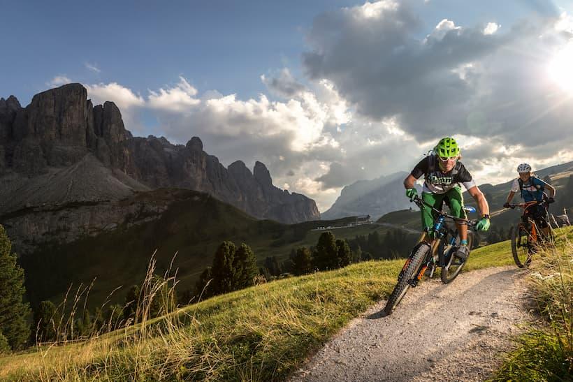 At Passo Gardena, the last pass of today's tour, we take another break to take in the astonishing sunset. The sky turns red and along with it the fissured rock faces all around us. Traffic on the trail is virtually nonexistent and the peace and quiet of the evening reigns over all. Each one of us just stands there alone with our thoughts allowing ourselves to be mesmerized. We take every bit of the moment in. We consume it. After the sun has disappeared over the horizon, we again hear that friendly familiar voice: “Dinner is waiting for you at the hotel, are you all ready?”