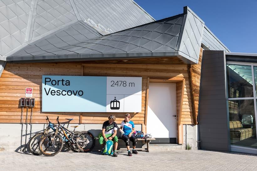 This early in the morning, the trails further towards Passo Campolongo are completely deserted. And, even as we continue on towards Arabba, we rarely come across any other cyclists. The gondola brings us from here up to 2,478m high Porto Vecovo. The summit station is directly across from Marmolata which, with its altitude of 3,343m, has the highest peak in the Dolomite Alps. The view towards the majestic glacier is so mesmerizing that we cannot convince ourselves to look away no matter how hard we try. The wind howls fiercely up here. Feeling the chill, we put on our windbreakers. A hot cup of coffee would definitely do the trick right now, but unfortunately during the summertime everything up here shuts down.