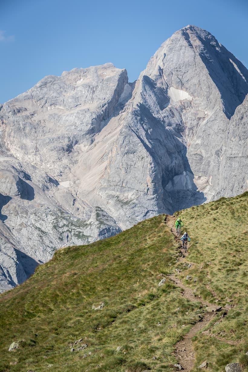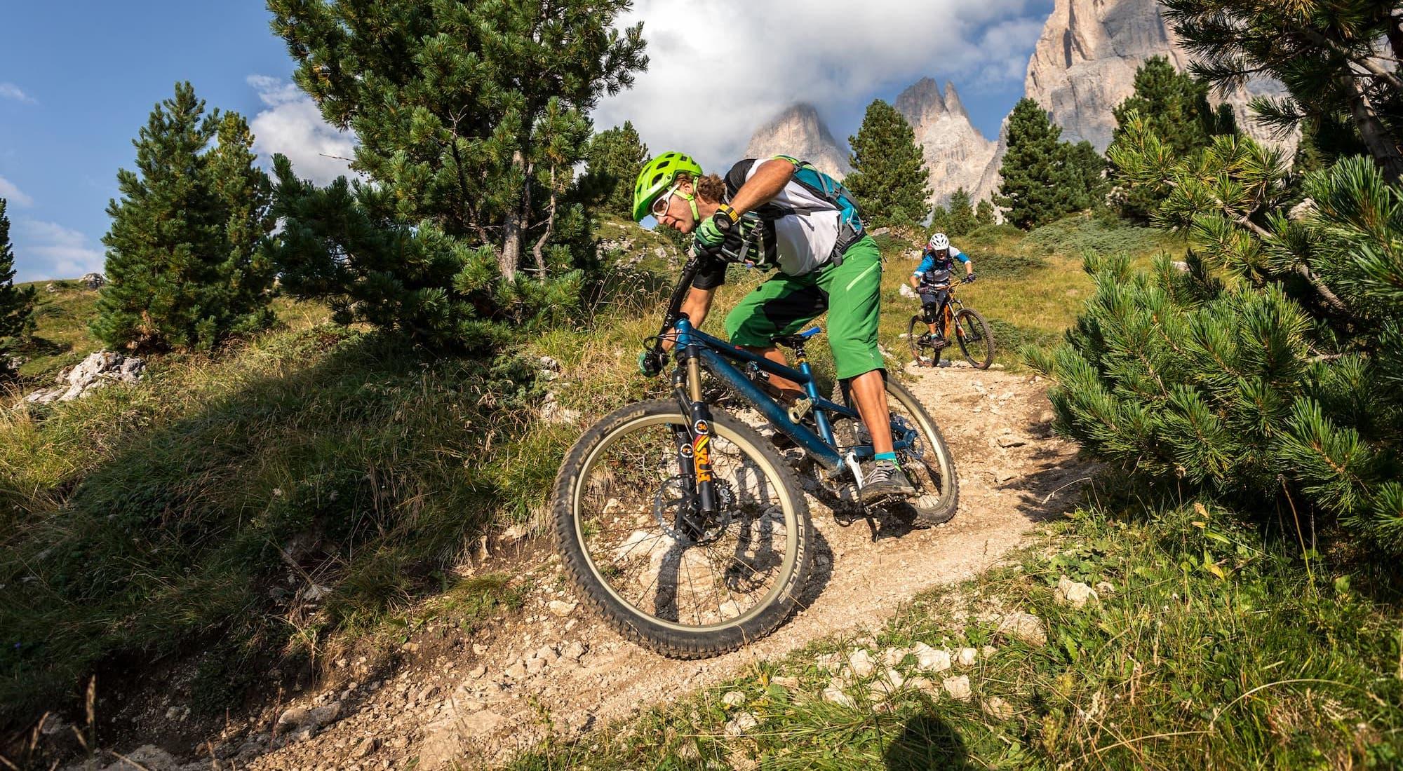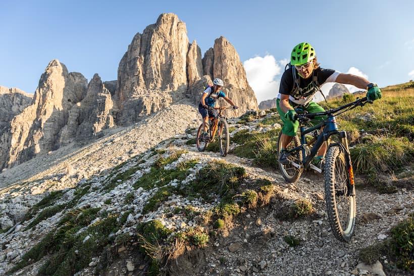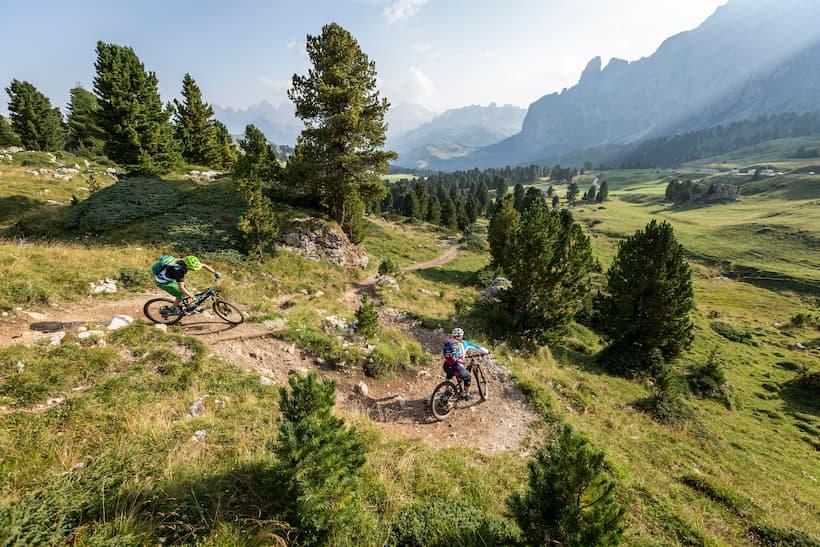 The combination of trails is fantastic. Along with nature trails, there are also trails made specifically for cyclists while others were just optimized. This means that the larger stones have been removed, the trail route has been adapted accordingly and crossings have been installed where there are fences. The paths created do not have the character of baby smooth crusher dust tracks, like you often find in bike parks today. Of course, there are also berms and some jumps every once in a while, but the natural characteristic of the ground has been maintained as much as possible. This way you almost always have the feeling you are traveling a natural trail, just slightly modified for cyclists. This concept is much appreciated as we make our way downhill from Passo Sella. Every inch is a blast. It is double the fun to be able to enjoy such a tour in a unique surrounding as in the Dolomite Alps.