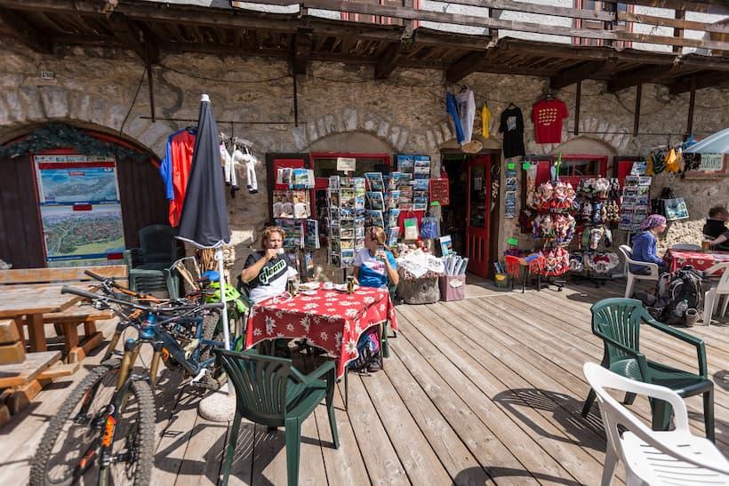 Hunger is calling and we sit down on a small terrace. The view couldn't be better. We can see directly towards the highest point of the road where entire swarms of motorcyclists, automobile and motorhome drivers fight over the few parking spots available. All of this while racing bikes, e-bikes and a few mountain bikes make their way between them. People from all walks of life are there. A colorful mix of languages can be heard coming from the souvenir stand behind us. Fitting to the cosmopolitan scenery around us, the menu is also an exciting mix of typical traditional Tyrolean specialties blended together with Italian influences. Many of the products such as cheese, ham and wine are from local farmers. Of course, to round it all off, we have to have an espresso. This really gets our engines revving and we are ready for the next downhill run.
