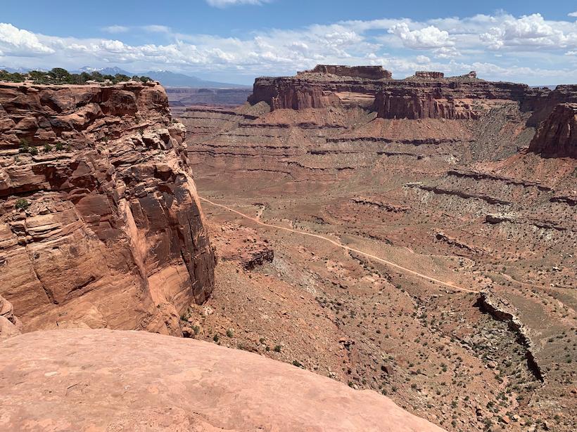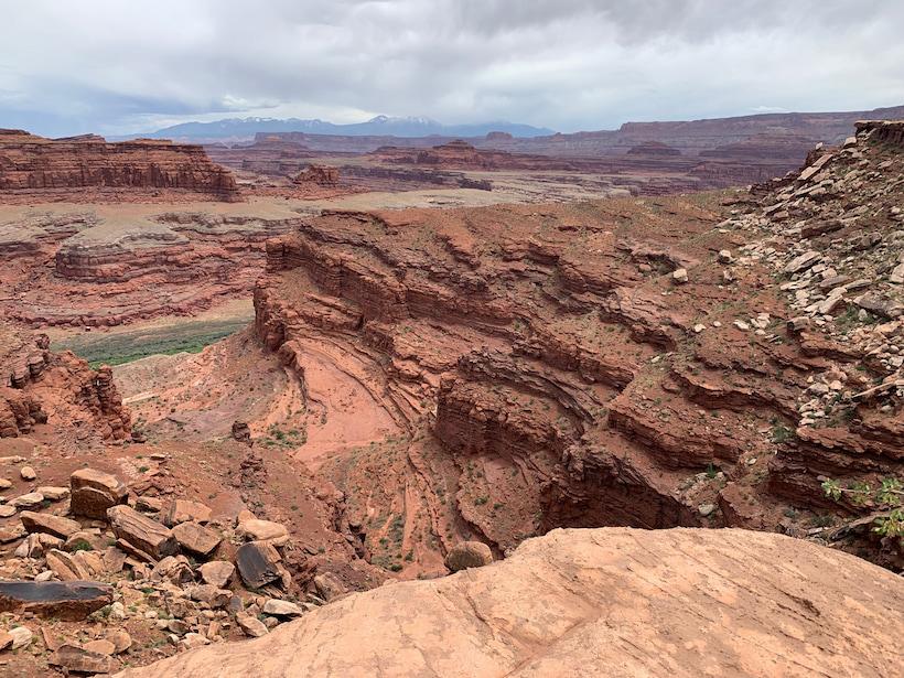 After school drop-off the next morning, I drive down from the mountains three hours to Island in the Sky—a flat-top of orange globemallow in Canyonlands National Park—and begin loading my bike. A gnat attack is almost a deal breaker, but I discover some Buzz Away in the glovebox. By 2 p.m., I’m off, adjusting to the loaded handlebars and disc brakes on a shaky 1,200-foot descent of the sinewy Shafer Trail with 43 miles to ride to Murphy’s Hogback campsite. It’s late May, when desert temperatures can reach 100F degrees, but the forecast is for clouds and a reasonable 75F. We’ve had a big winter with 200% of normal snowpack, and cool, wet conditions persist.