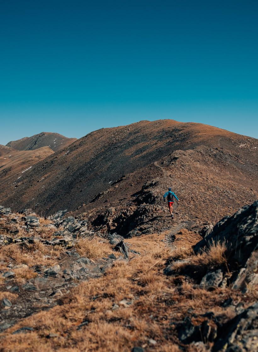 The air was noticeably cooler up here, which was the perfect running temperature. I pulled my light windproof sleeves down, unclipped my poles, and settled into the slow steady climb, with a distance of 22K and almost 2,000M of elevation gain. This was only the initial trek. I had the choice of catching the train again to reach the ridgeline but decided to keep running. Seventy percent of this new route involved a 2,700M climb, and I was prepared for it to be a bit of a slog. I quickly encountered a long, steep climb up some icy scree, which turned into a fast hike. I'd already been running for a few days and wanted to make sure I had enough energy to run the rest of the beautiful ridgeline.