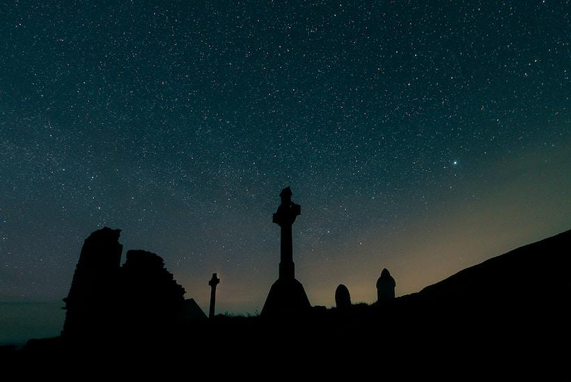 Night skies above the churchyard on Bardsey Island. Photo by Loz Blackwell