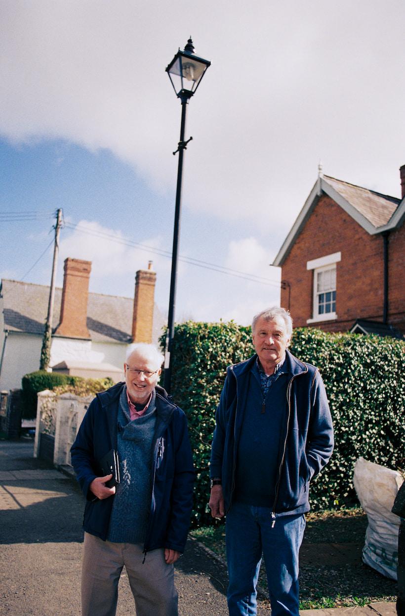 Leigh Harling-Bown and Colin Kirkby beneath one of Presteigne’s heritage-style streetlamps—fitted with amber LEDs to reduce skyglow and protect the night. Photo by Ella Calland