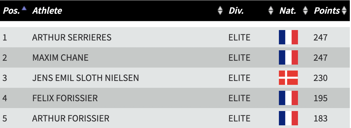 The top three men, Arthur Serrieres, Maxim Chane, and Jens Nielsen haven’t placed outside of the top 5 at any of the rounds so far (with the exception of Nielsen’s 7th in France).