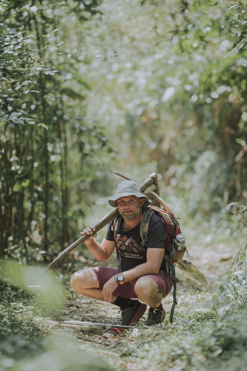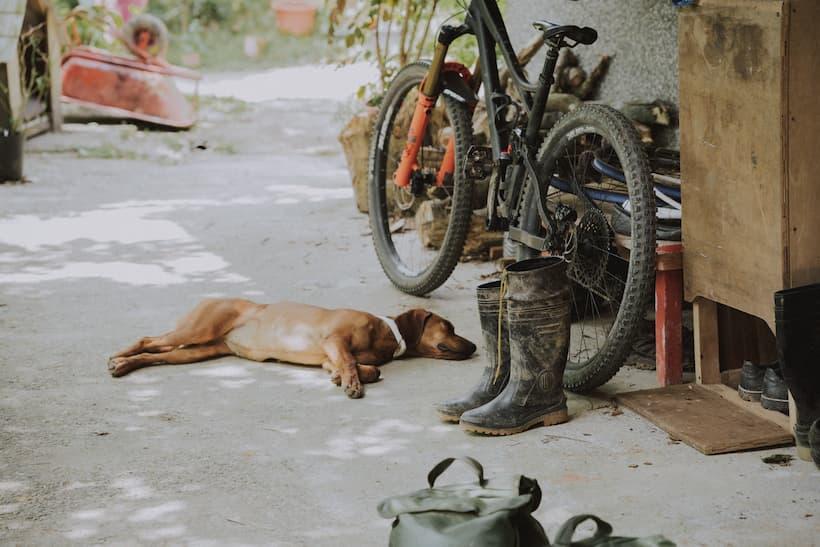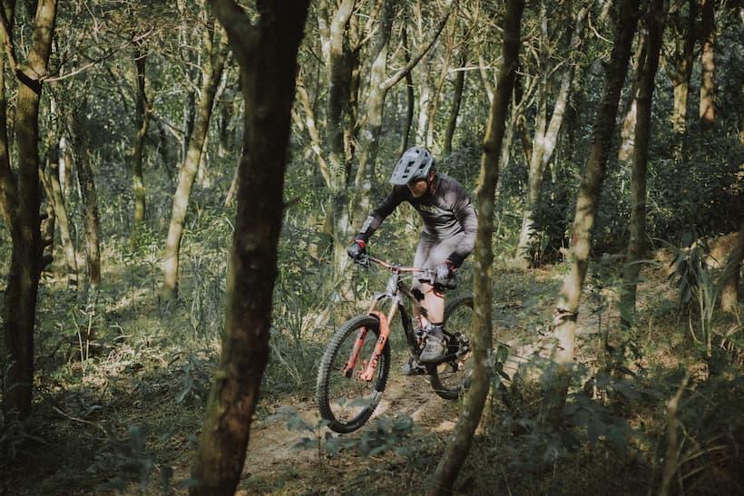To the left is Java, Luke's tugou cross bloodhound, still deep asleep on the outside sofa - legs spread wide and definitely not dreaming about the wild pigs she’s supposed to be keeping off the trails. Past her is the post-ride dipping pool, the outdoor bamboo shower, and a 1-metre gap to the entrance of the Bosvark line. Records were made to be broken, but as far as the quickest possible transitions from brushing your teeth to sending a trail go, this has to be up there.